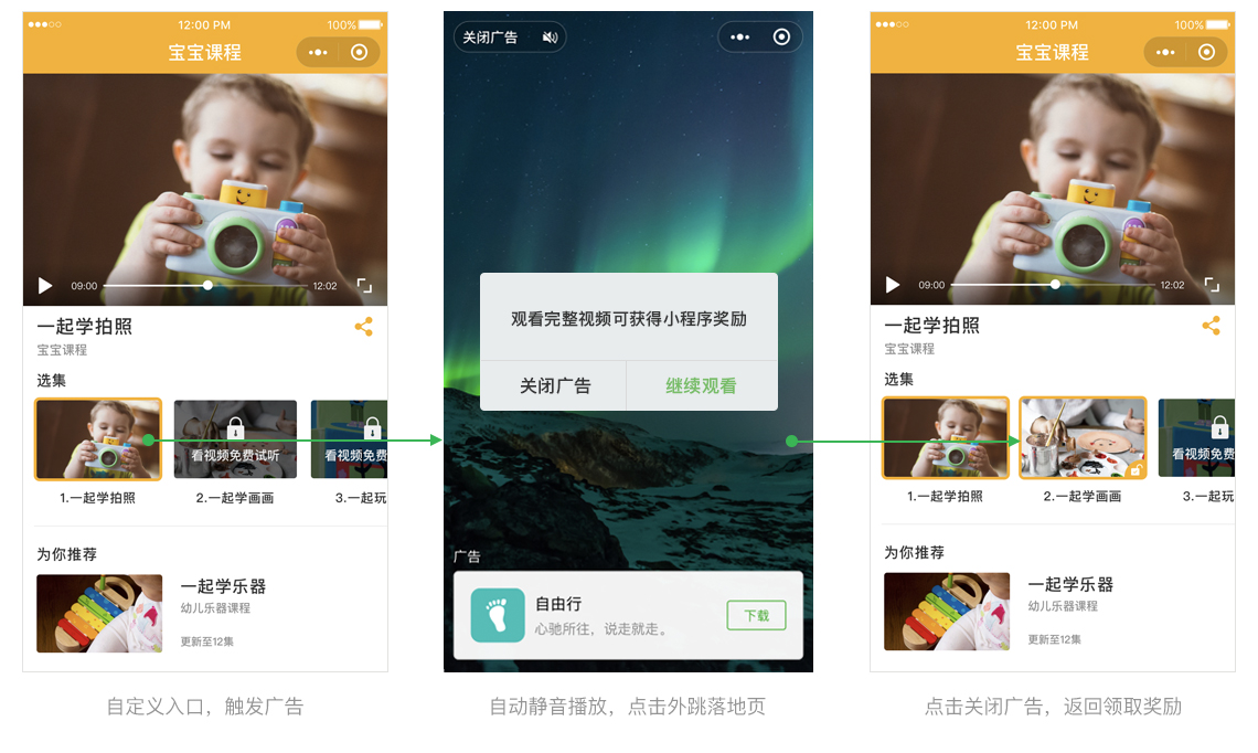 1.小程序激勵式視頻廣告是指用戶在小程序內主動觸發的一種廣告模式,用戶完成廣告視頻觀看后可獲得流量主設定的相應獎勵。
