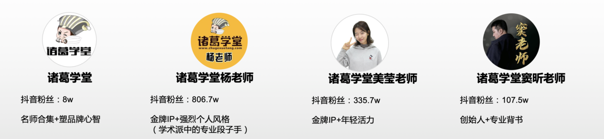 諸葛學堂官網:名師授課拆條集錦,通過打造老師個人IP推動品牌營銷,塑造品牌占據用戶心智,是一個偏pr色彩的賬號。