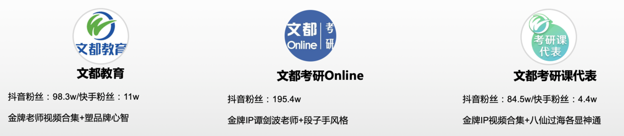 ? 文都教育是總部位于陜西的一家教育考試平臺,業務覆蓋大學教育、職業教育和校企合作等教育培訓領域。主要布局抖音,單一平臺賬號矩陣總粉絲量400萬+,快手剛剛入駐,不久前在快手披露的「快手教育生態合伙人」,文都教育也是其中一員。文都教育有意思的一點是,地方學校也紛紛布局了抖音賬號且運營不錯。賬號「湖北文都教育」抖音粉絲163.4萬,「湖北文都考研」抖音粉絲88.6萬。